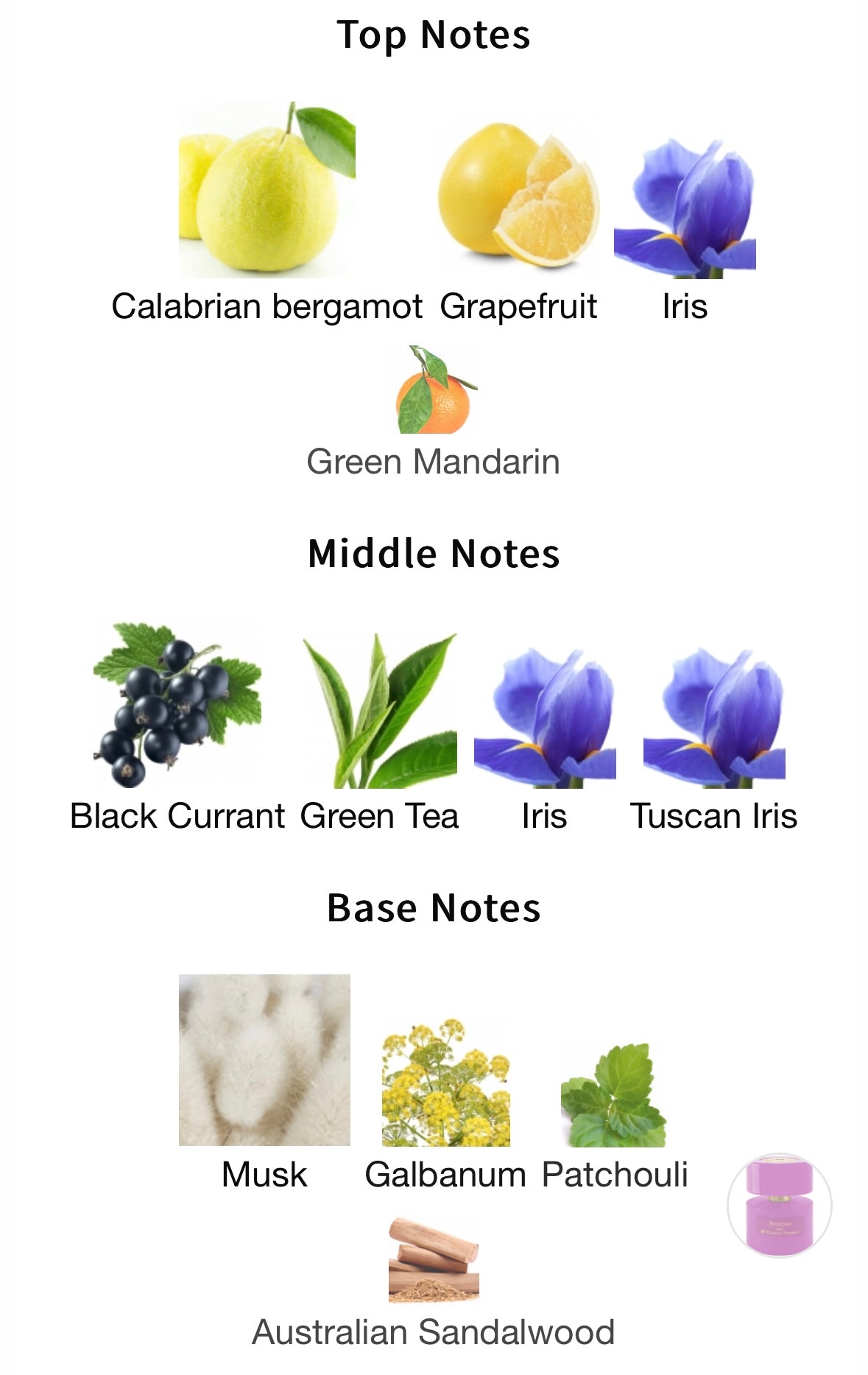 • Heart Notes: The middle layer unveils a refined harmony of black currant and green tea, with a triple infusion of iris, including the rare Tuscan iris, adding depth and sophistication.